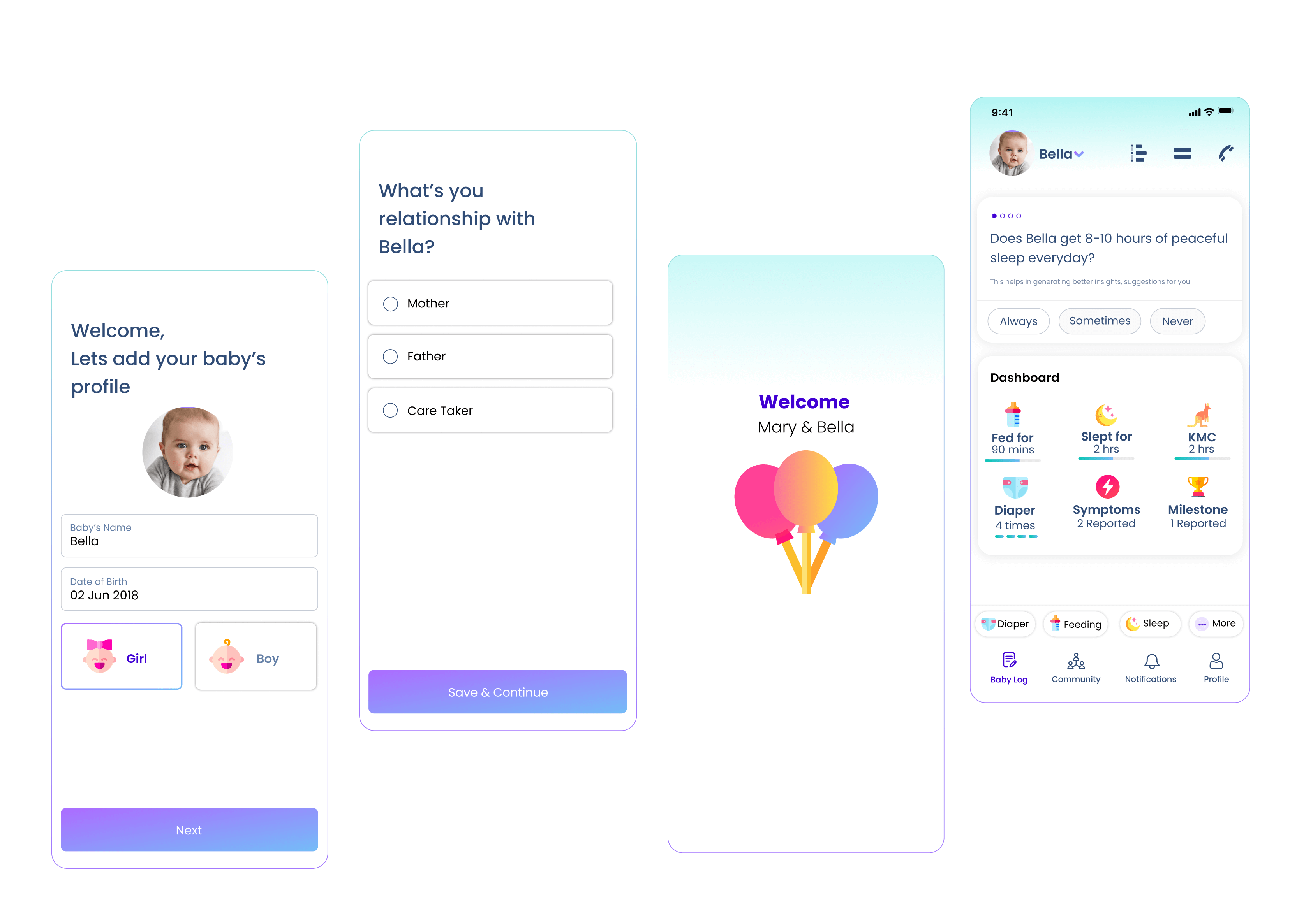 App starts with basic questions like details of baby and relationship of account creator with baby. And with a bubbly ballony welcome, we get started on journey of digital parent hood.