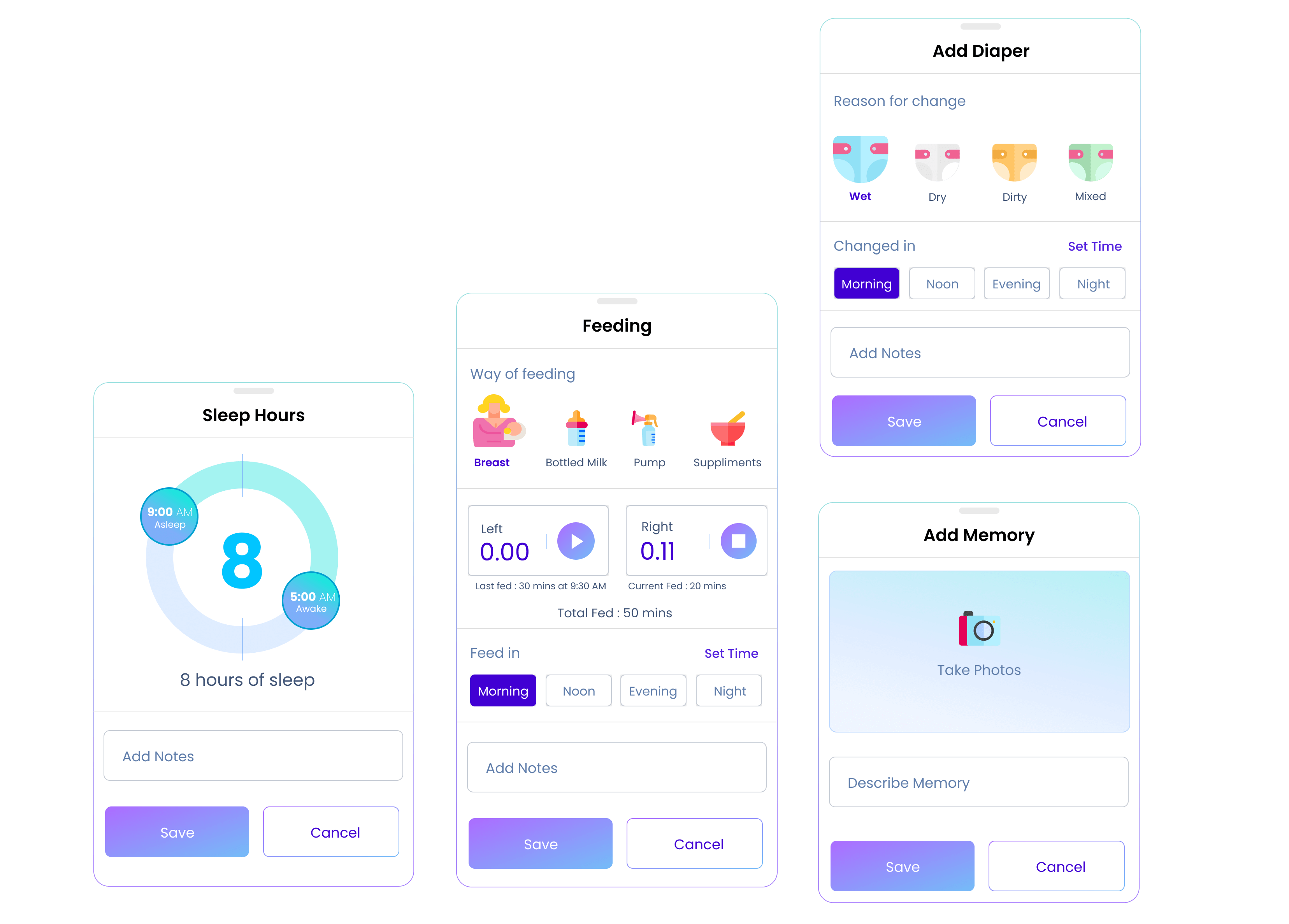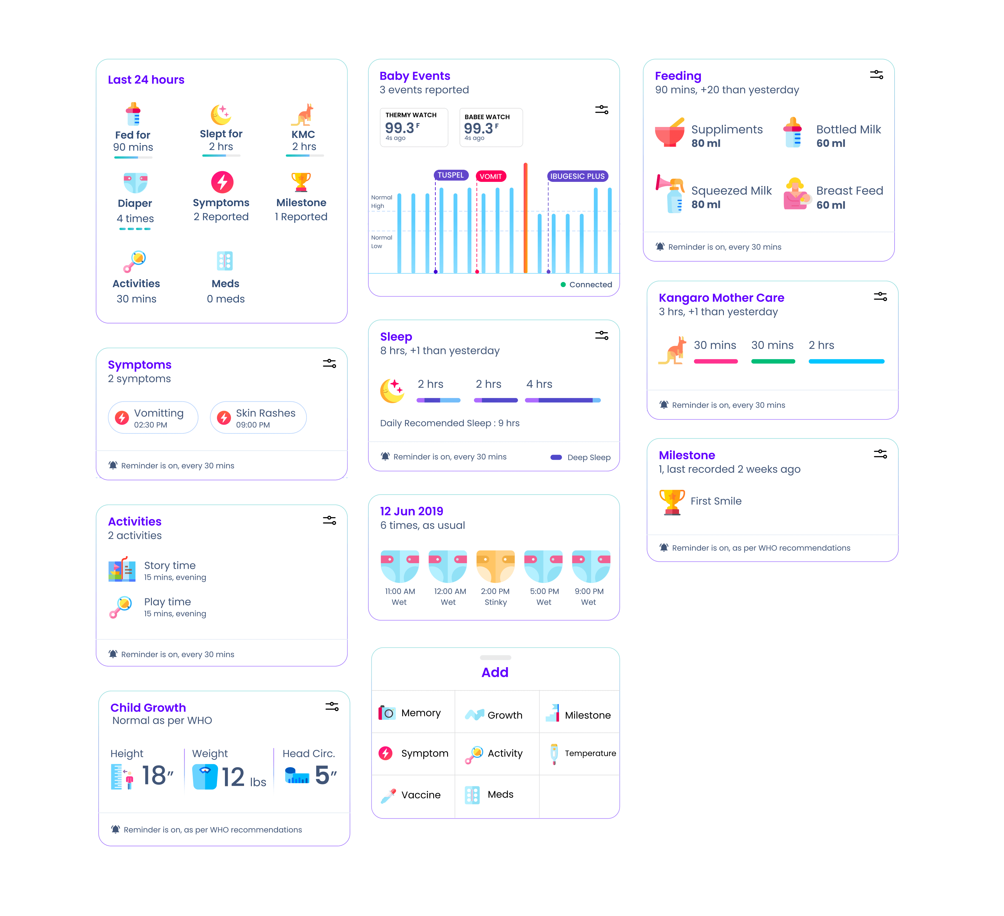 Noting events like feeding time & pattern, diaper change pattern helps us recommend better practices to nurture the maternal relationship with baby and hence we made it delightful and engaging for mother who take a note of these baby events.